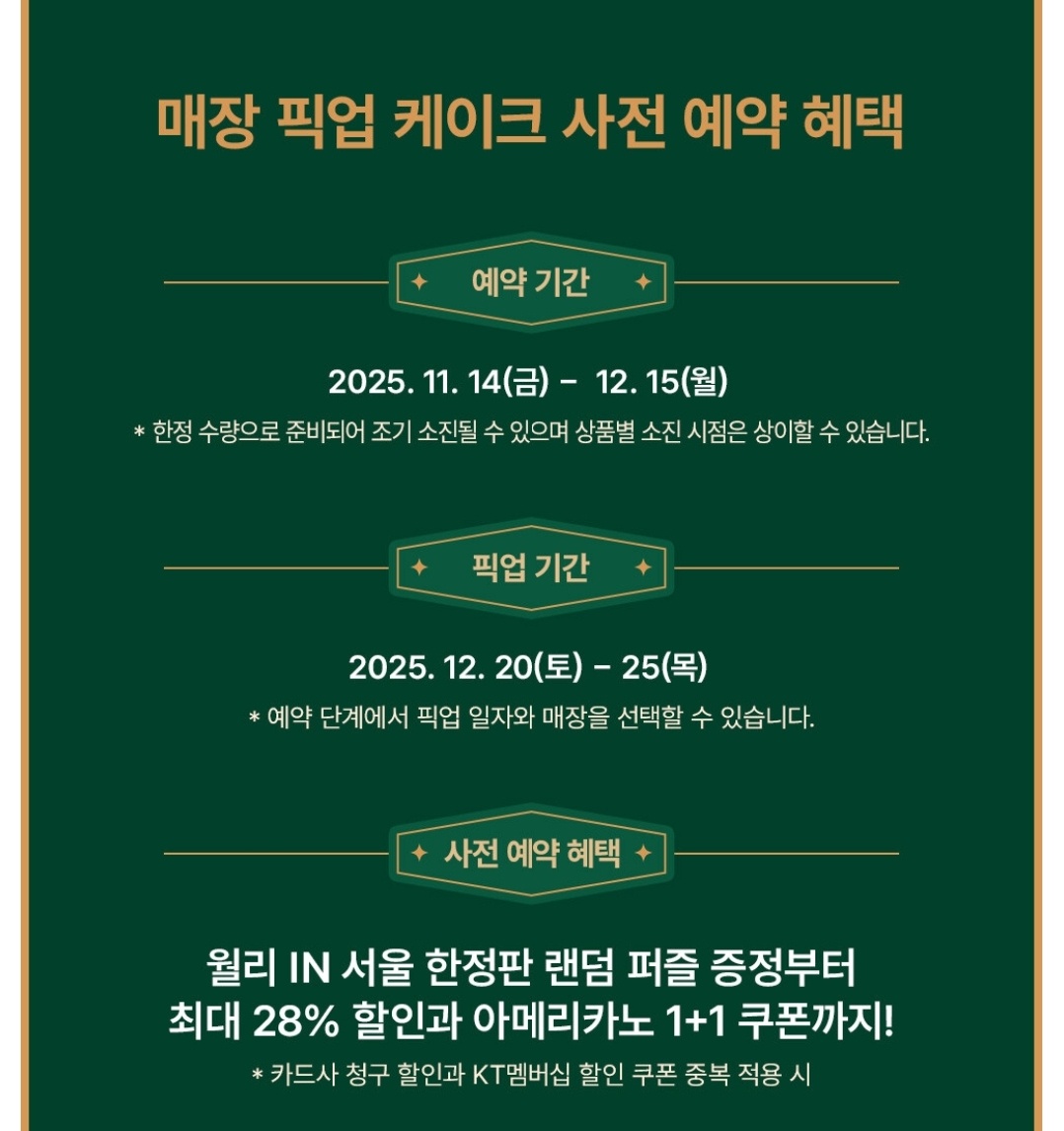 케이크 수령은 12월 20일부터 25일까지 지정한 매장에서 간편하게 가능하며, 일부 케이크는 원하는 주소로 택배 배송이 가능합니다. 배송 희망 시 예약 가능한 일정을 반드시 확인하고, 매장 수령의 경우 당일 예약·픽업은 불가하니 미리 예약해두는 것이 가장 안전합니다.