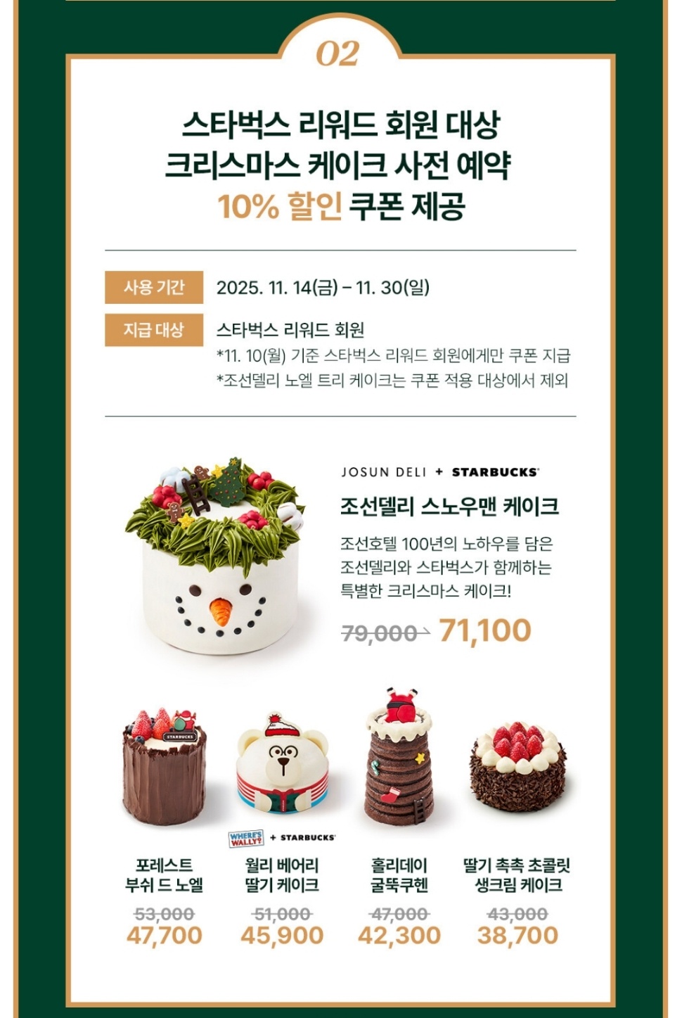 2025년 크리스마스 홀케이크는 11월 14일부터 12월 15일까지 스타벅스 앱을 통해 온라인 사전예약만 가능합니다. 예약 기간 내에 원하는 제품을 미리 선점하세요.